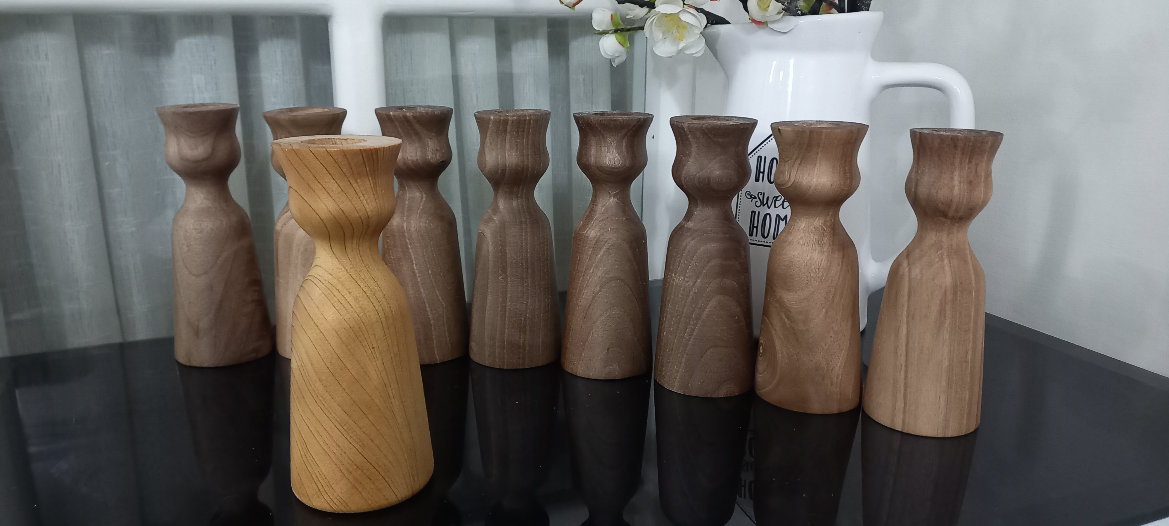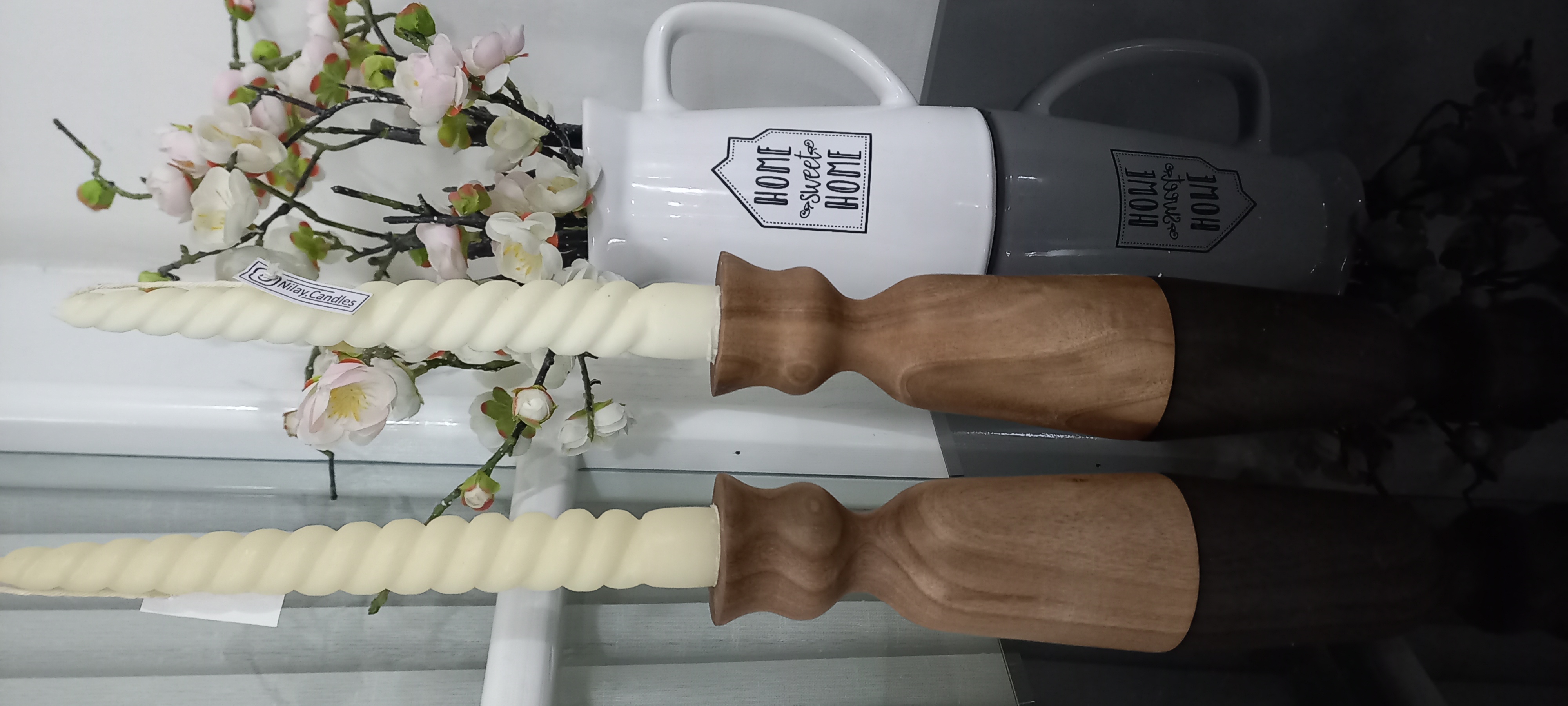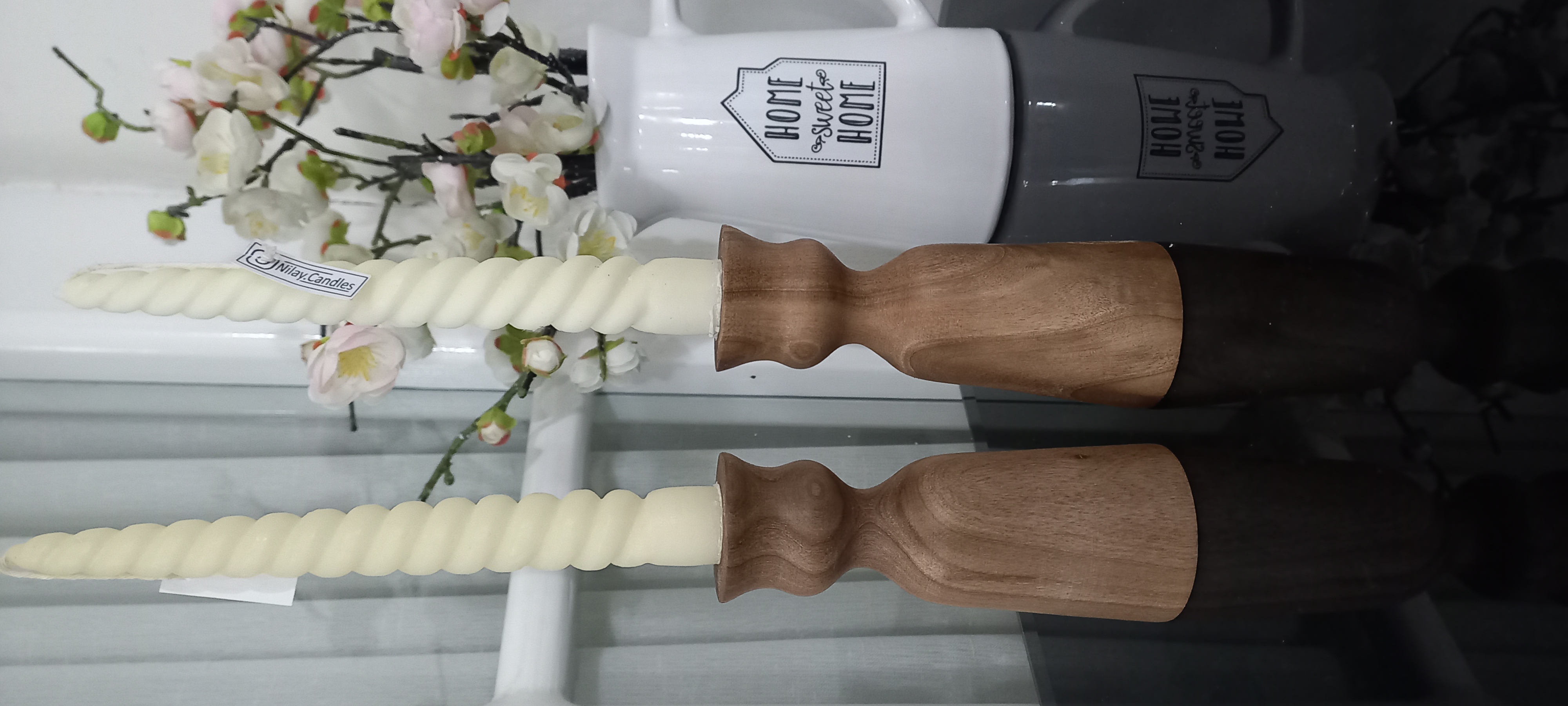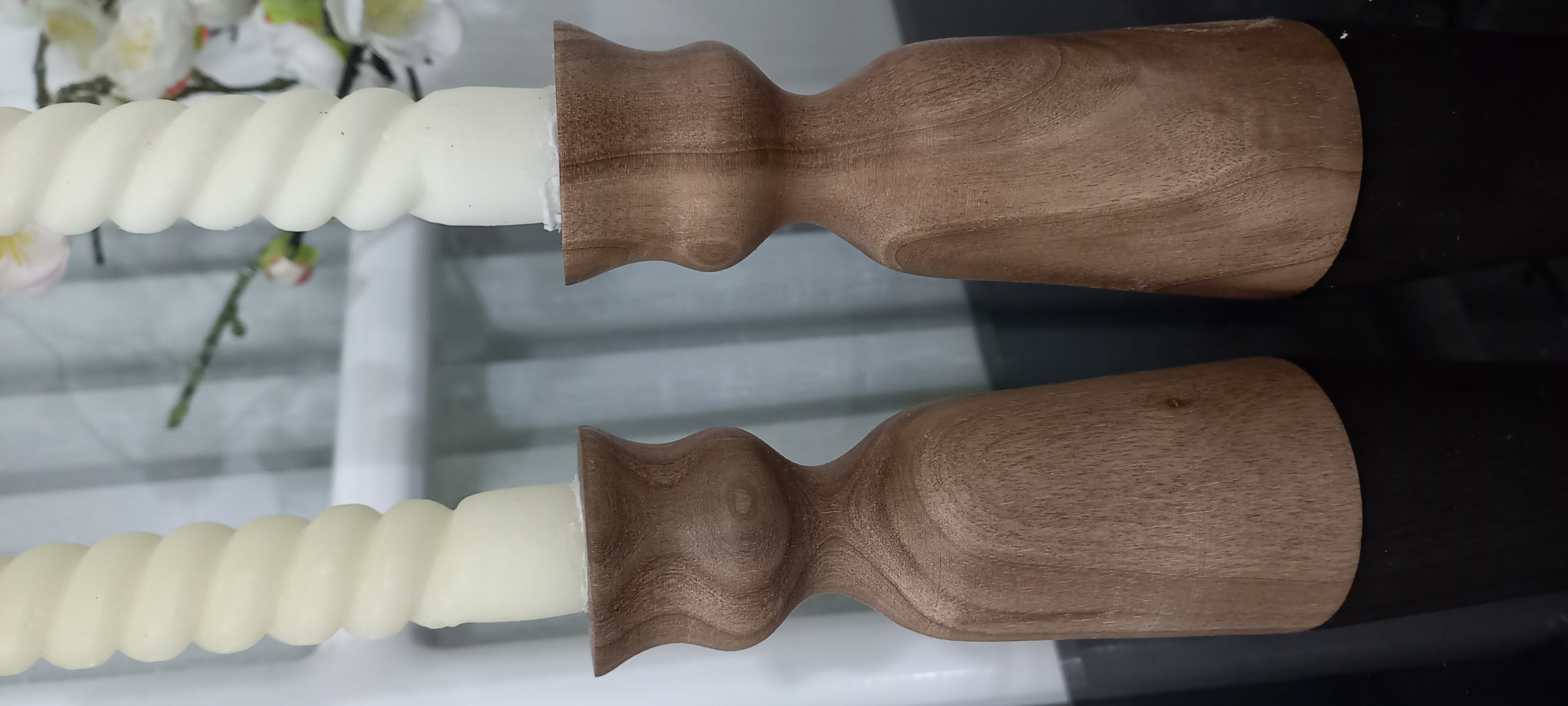 شمعدان دوتکه چوب گردو در دو رنگ تیره و روشن ارتفاع ۱۳.۵ سانت و قطر کار ۵.۵ سانت می باشد.