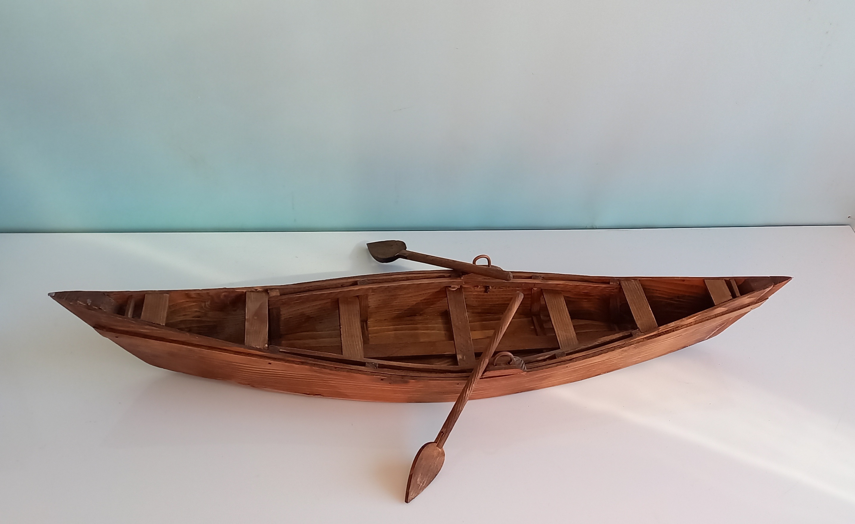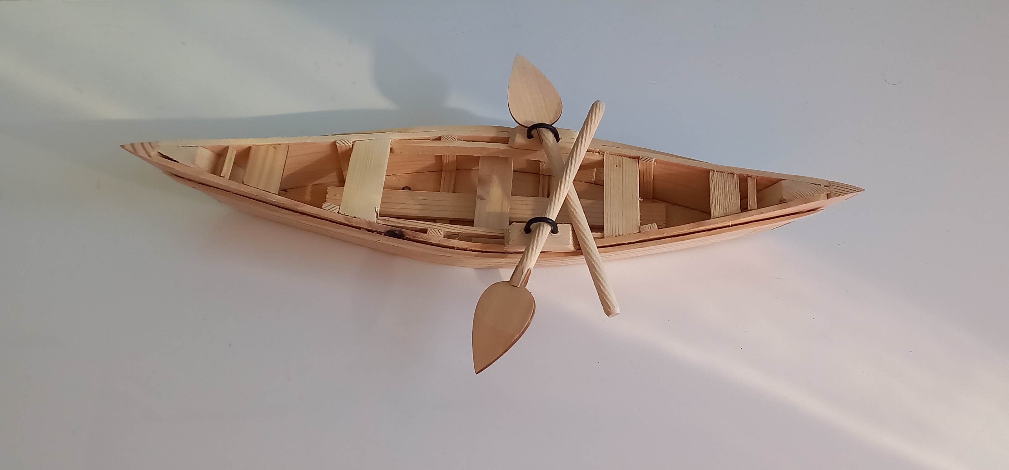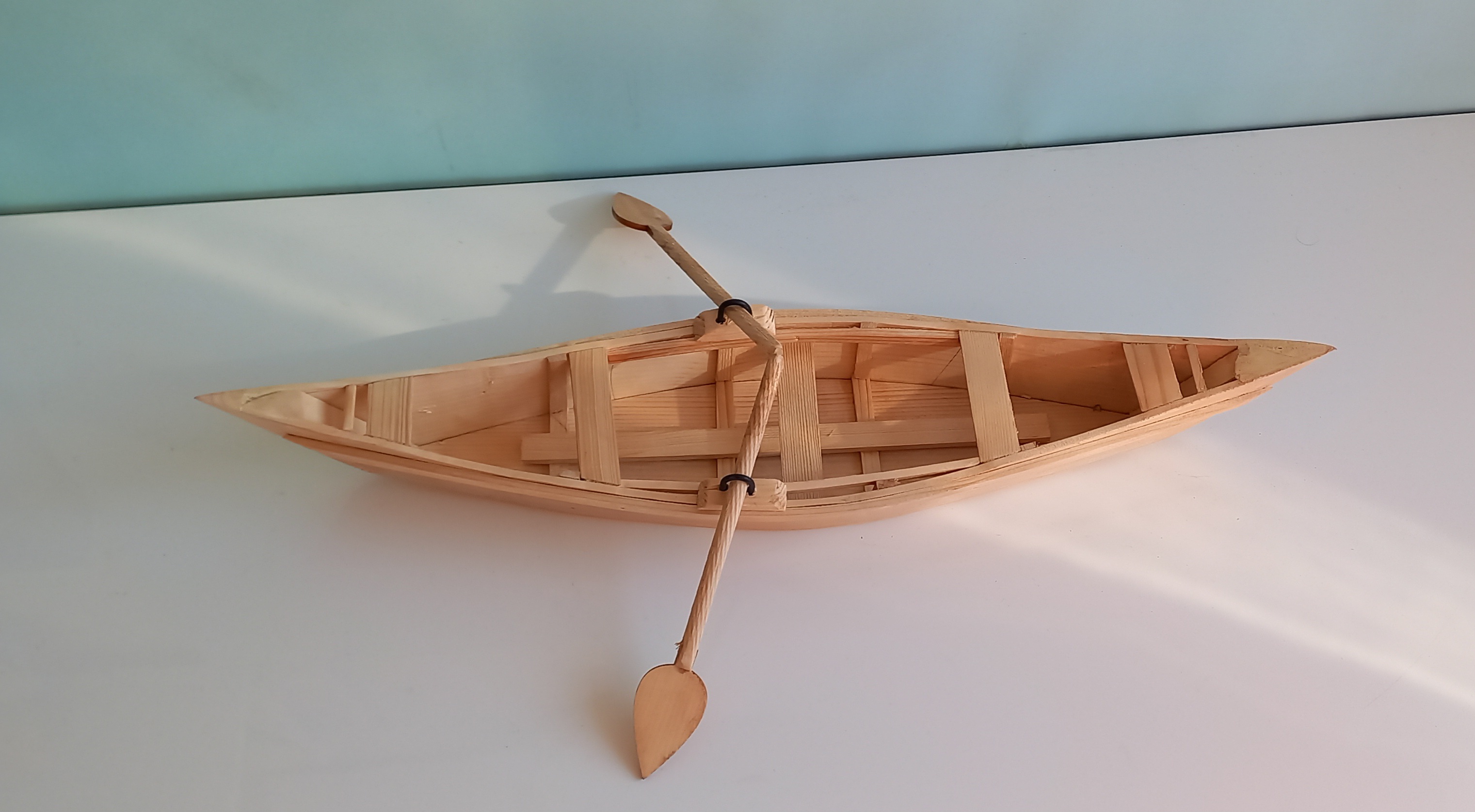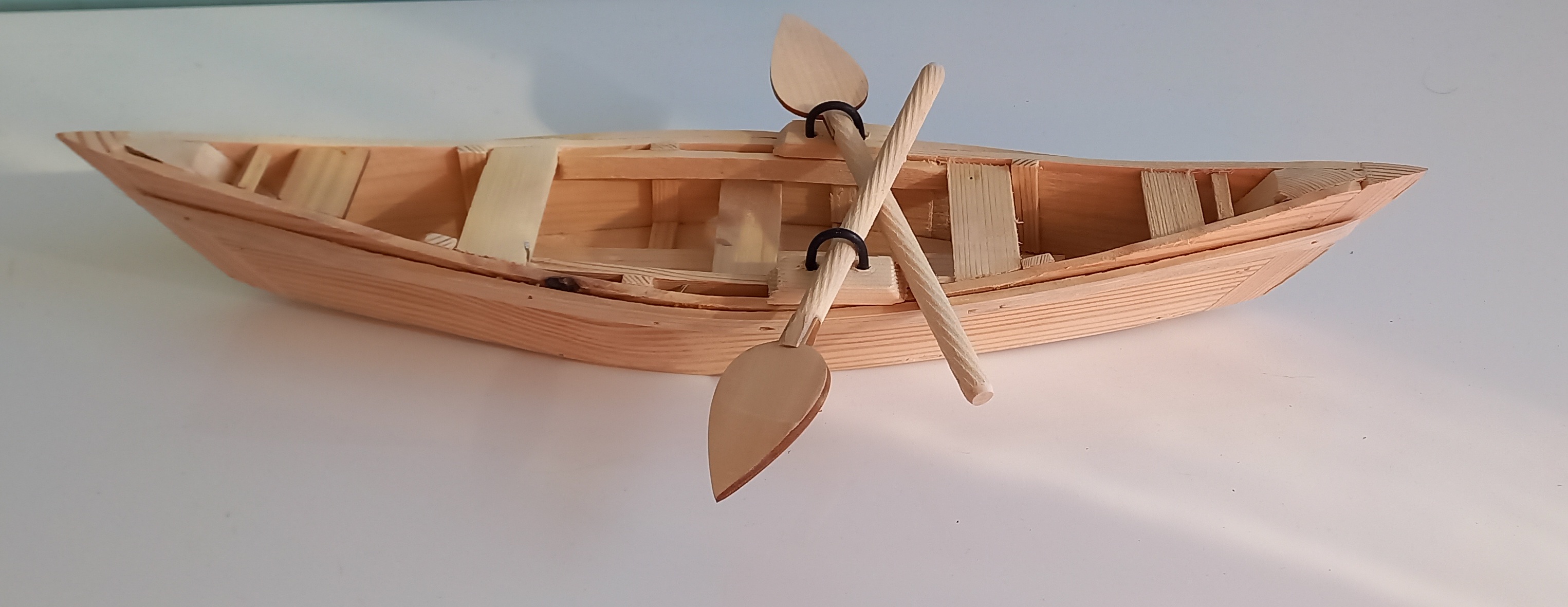 قایق کوچک رنگ کار قهوه ای روشن جنس محصول چوب نراد هستش و ابعاد آن ۳۸ در ۹ سانتیمتر هست.دارای دو عدد پارو است.