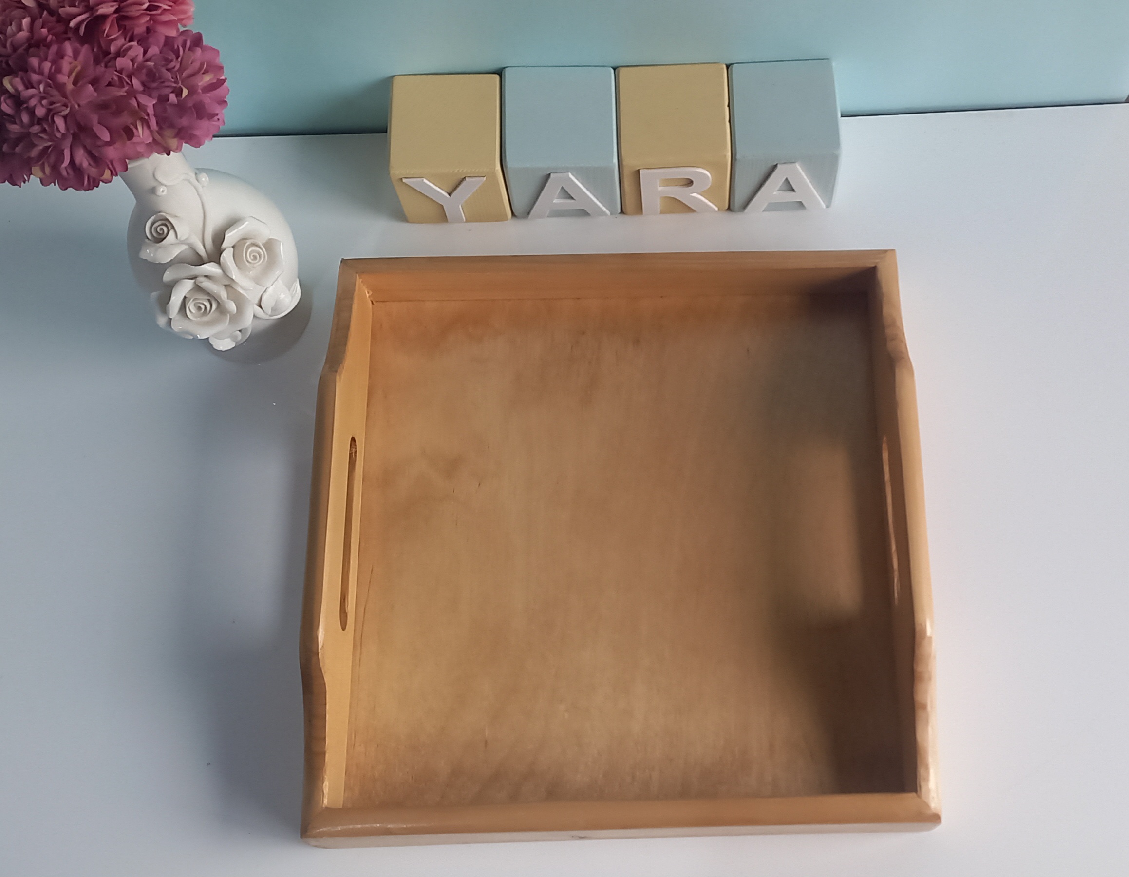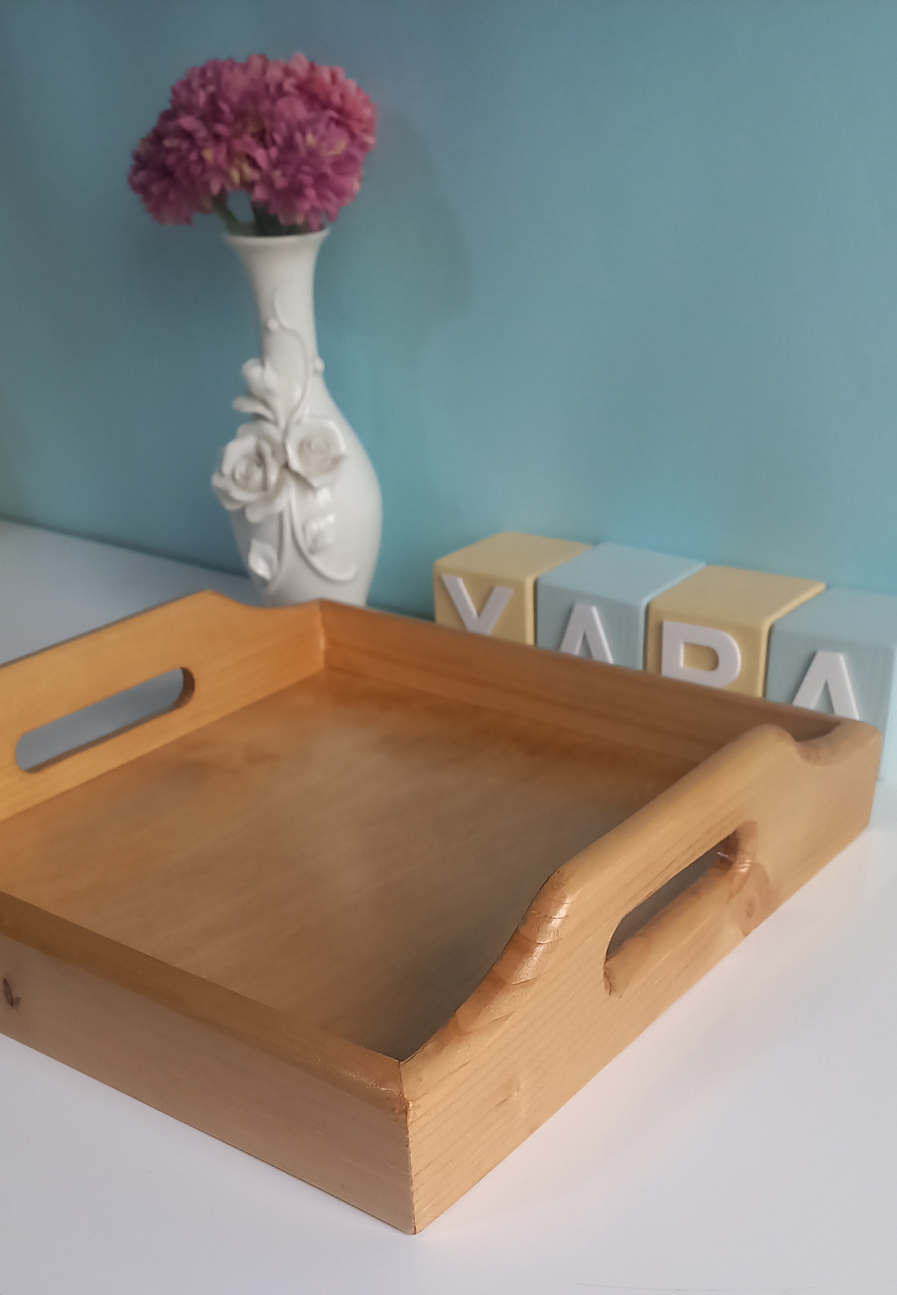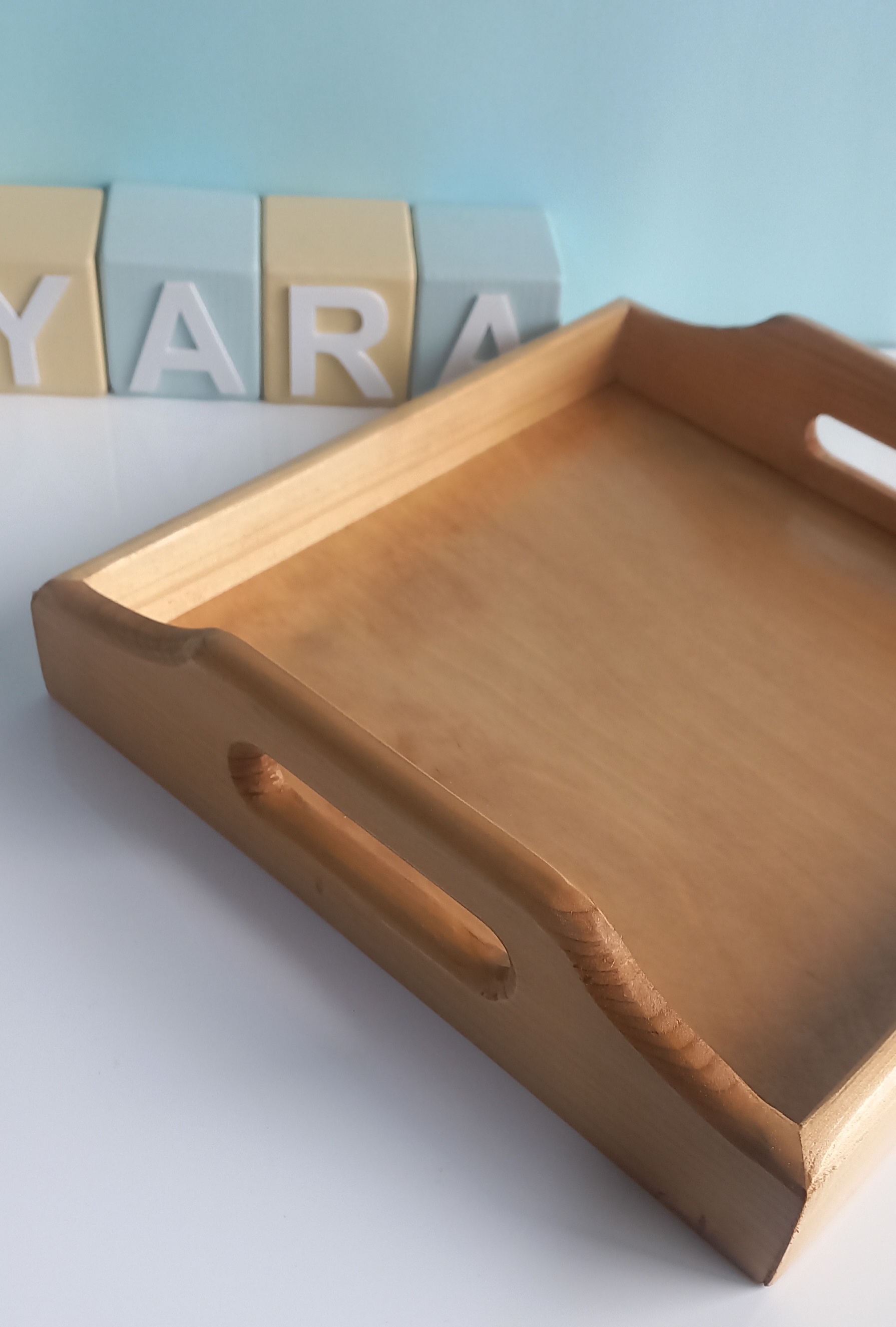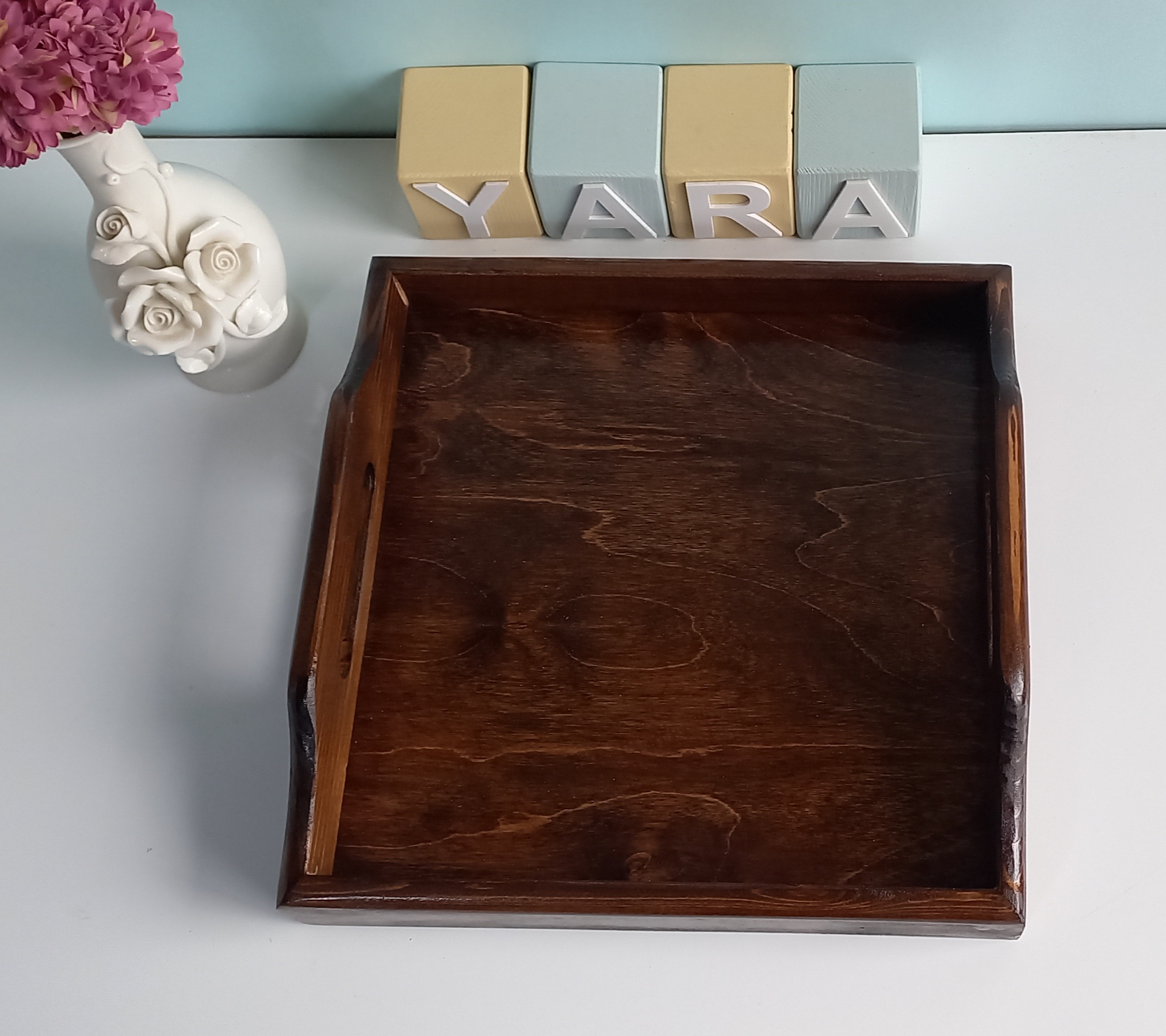 سینی چوبی مربع شکل در ابعاد ۲۷ در ۲۷ سانتیمتر و ارتفاع ۷ سانت در قسمت دسته ساخته شده از چوب روس در دورنگ تیره و روشن