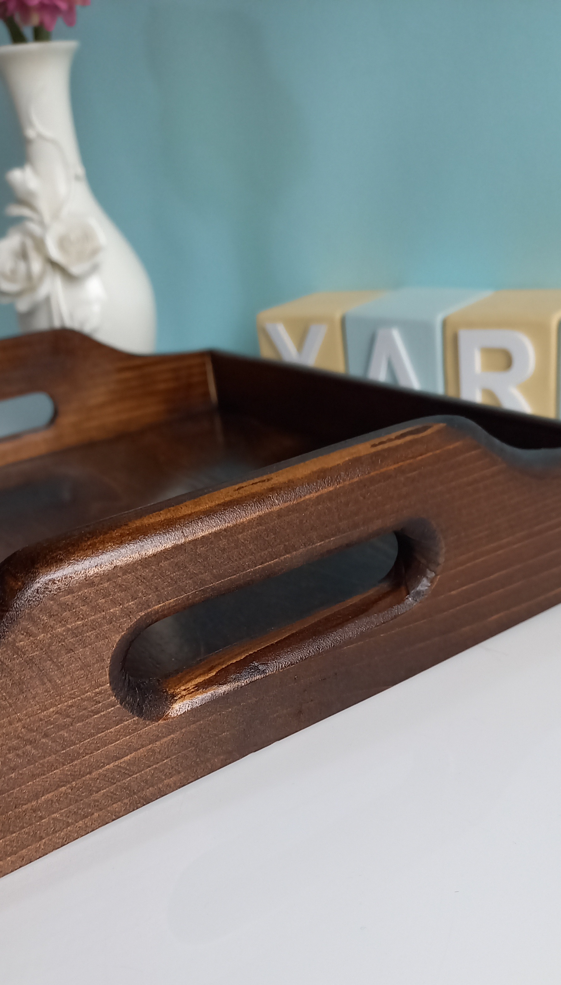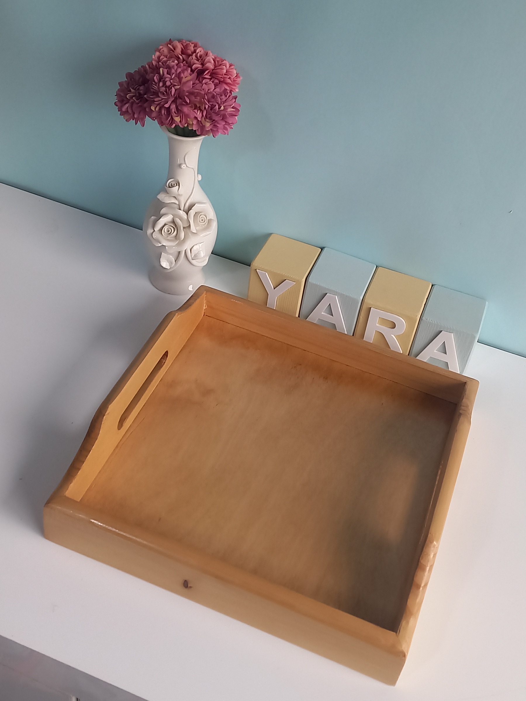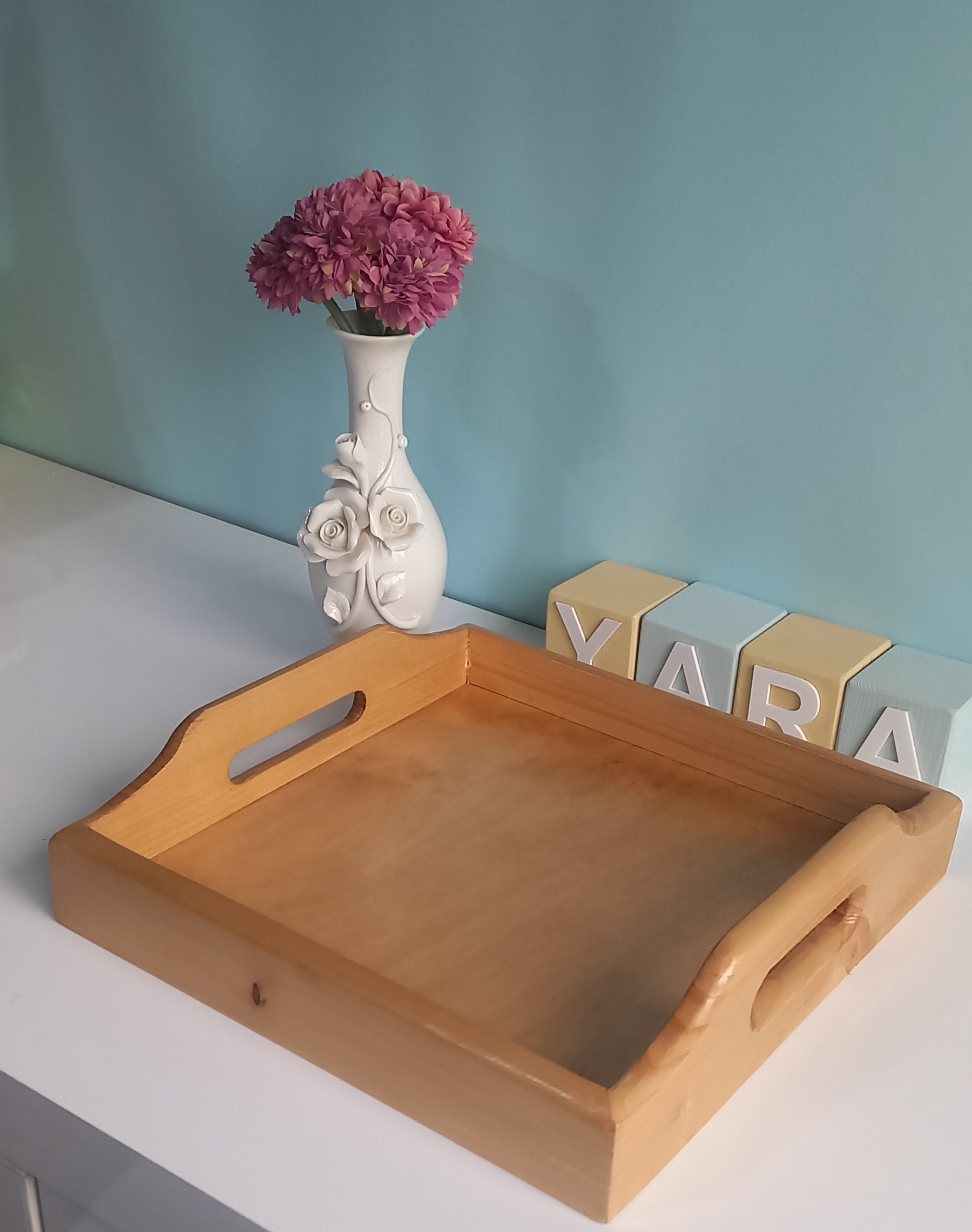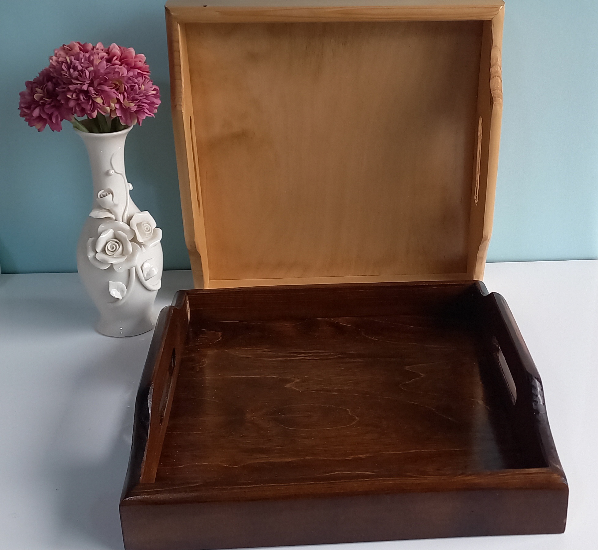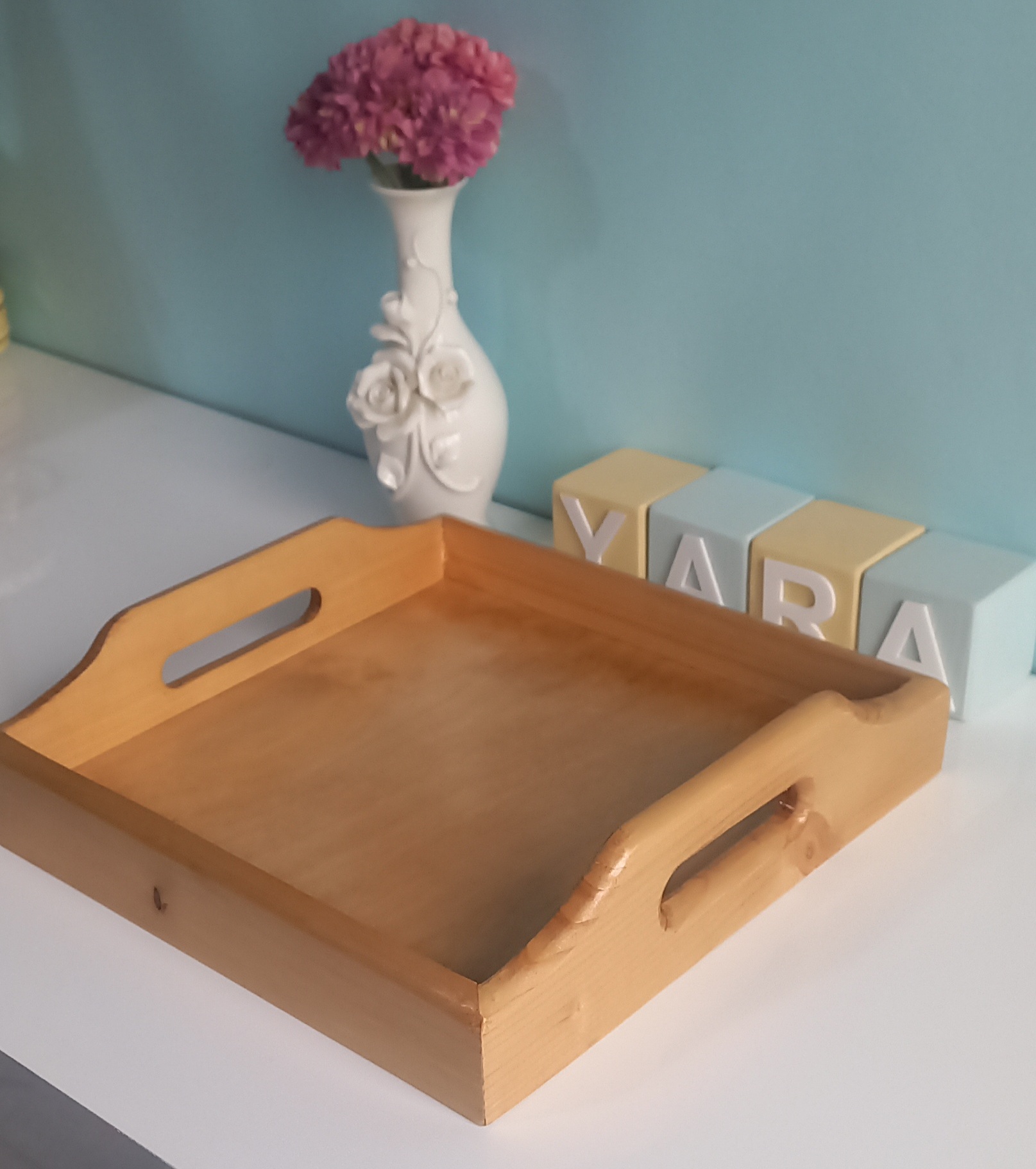 سینی چوبی مربع شکل در ابعاد ۲۷ در ۲۷ سانتیمتر و ارتفاع ۷ سانت در قسمت دسته ساخته شده از چوب روس در دورنگ تیره و روشن