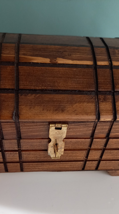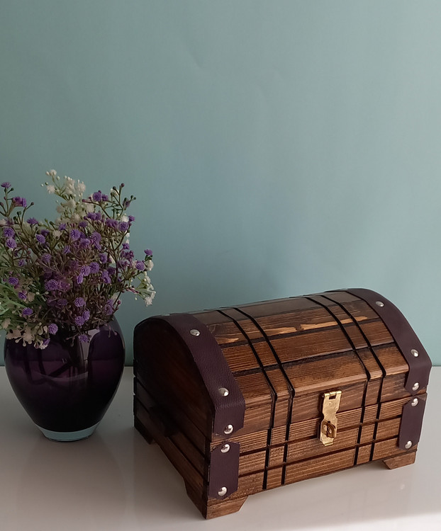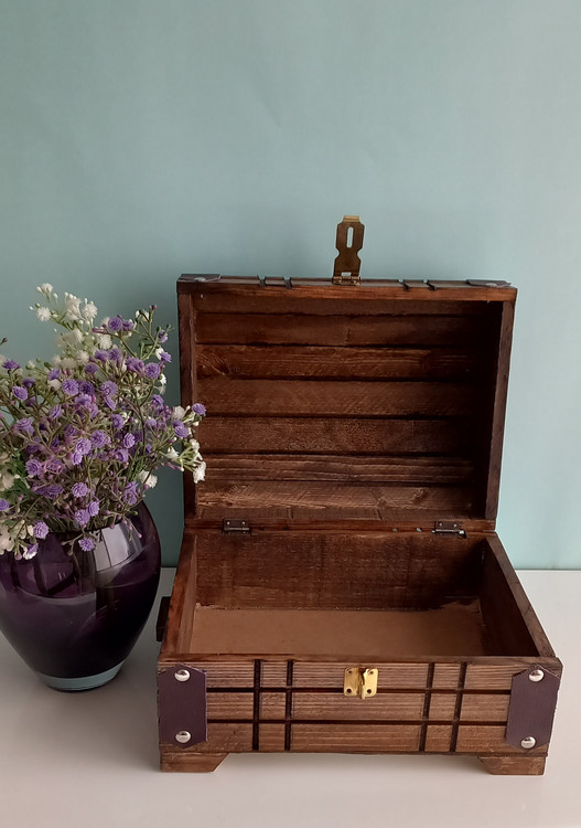 صندوقچه چوبی قفلدار روی اینکار چرم قهوه ای پانچ شده و رنگ کار قهوه ای نیمه براق هست و ساخته شده از چوب روس و در ابعاد ۲۵ طول وعرض ۱۹ و ارتفاع ۱۶ سانتیمتر می باشد.