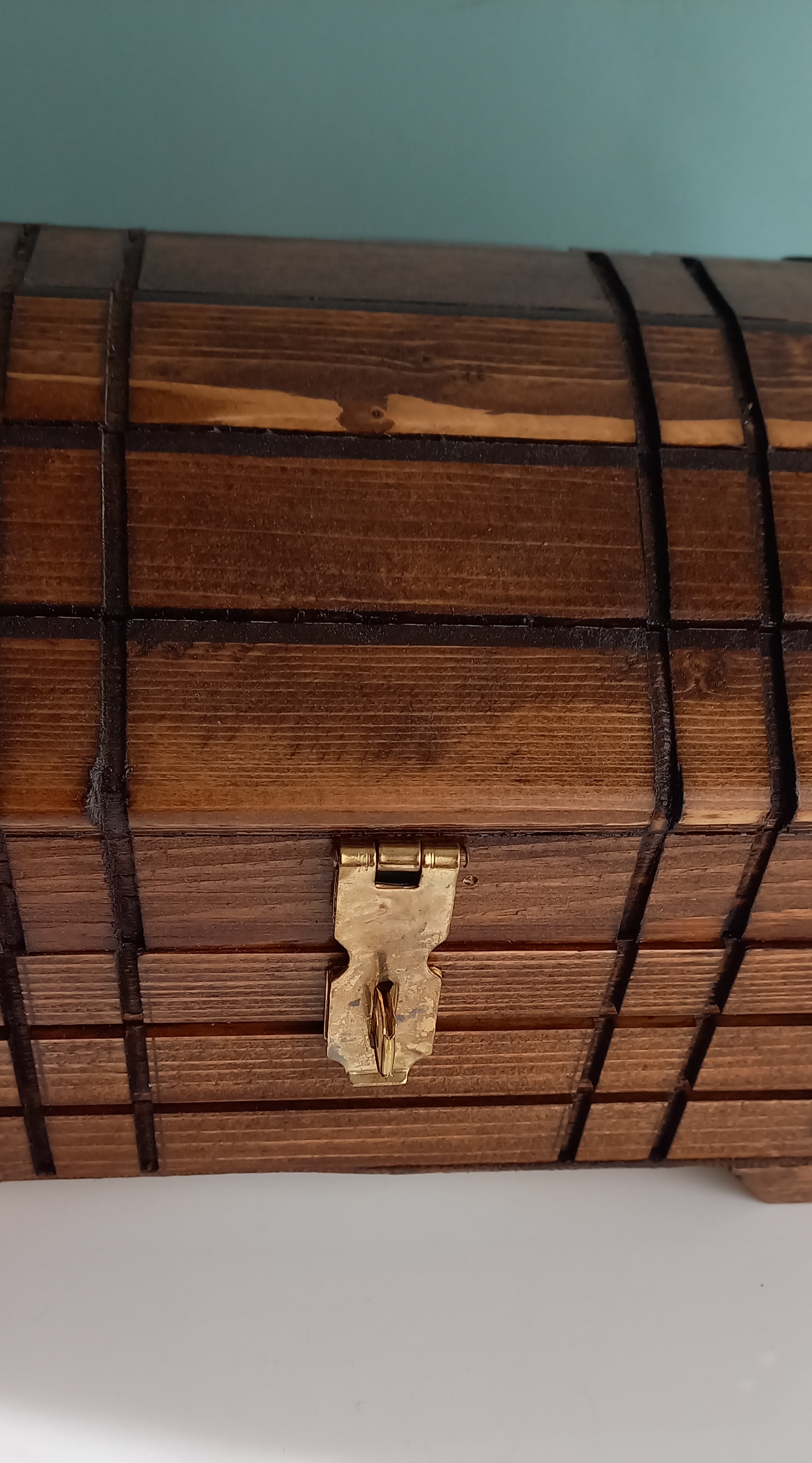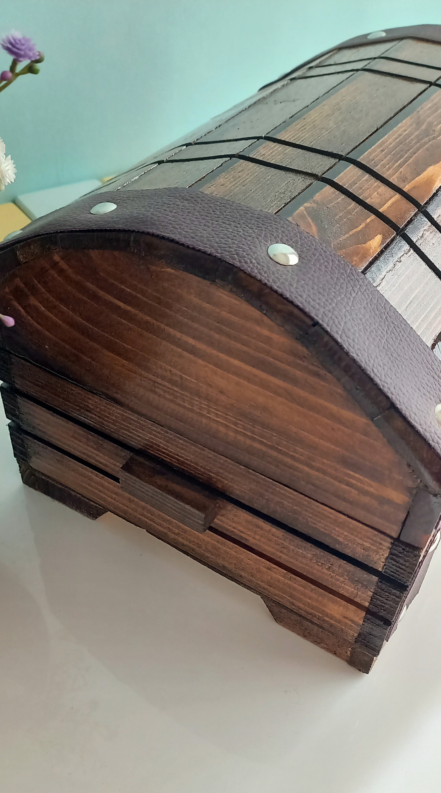 صندوقچه چوبی قفلدار روی اینکار چرم قهوه ای پانچ شده و رنگ کار قهوه ای نیمه براق هست و ساخته شده از چوب روس و در ابعاد ۲۵ طول وعرض ۱۹ و ارتفاع ۱۶ سانتیمتر می باشد.
